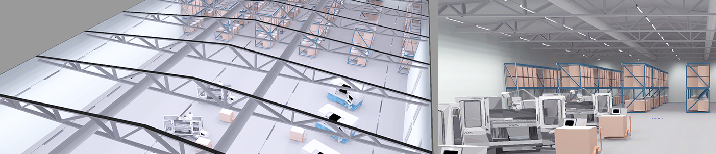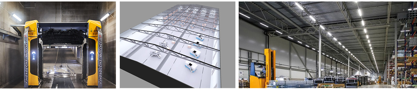 I exempelvis höglager rekommenderas optik som riktar ljuset längs gångarna för jämna luxnivåer. Närvaro och dagsljusreglering gör att belysningen bara används där och när den behövs. I detta fall Tänker man även på korsande truckflöden: god belysning minskar risken för skuggor och ökar säkerheten.