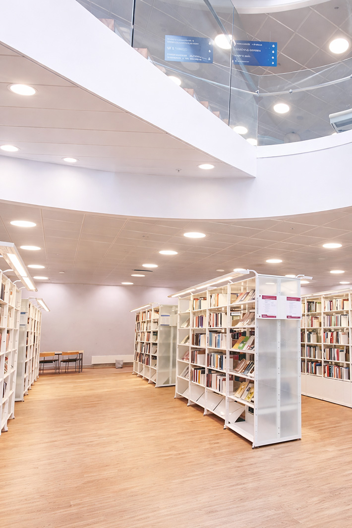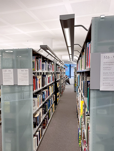 Projekt för Borås Universitet med ett stort antal hyllbelysningar. För att bibehålla armaturen och slippa göra åverkan på hyllorna så tog vi fram en modern insats med förbättrad ljuskvalité.