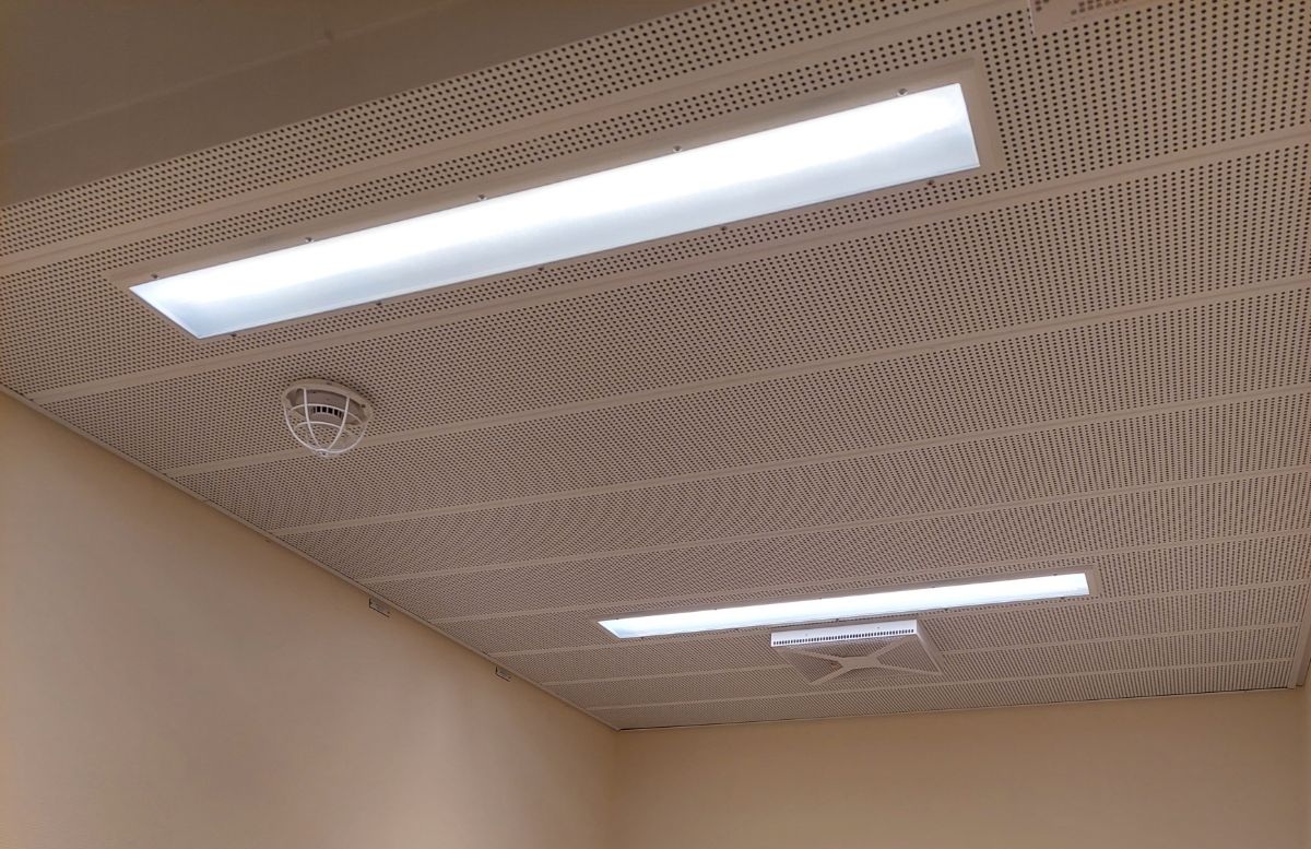 Projekt för Växjö Stadsbibliotek med ett special tak i plåt. Armaturen var lite konformad invändigt, 2 x42w ljuskällor , ersattas med en modern insats med förbättrad ljuskvalité.