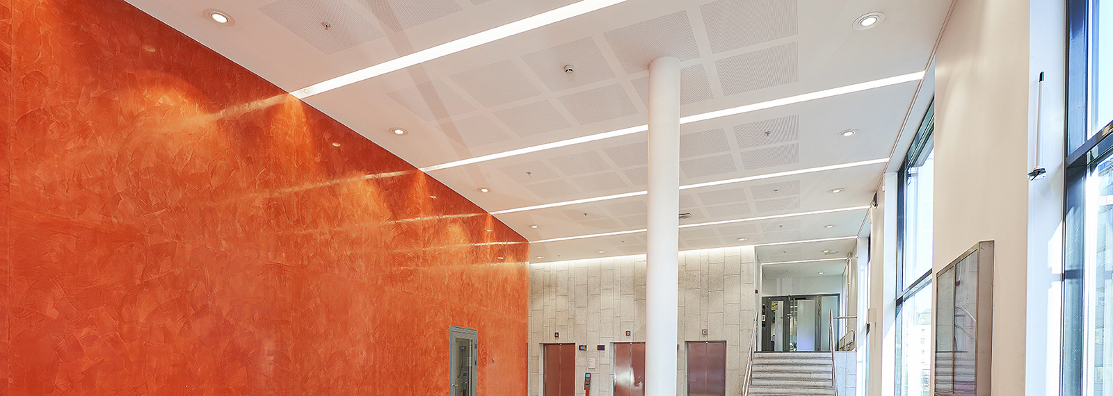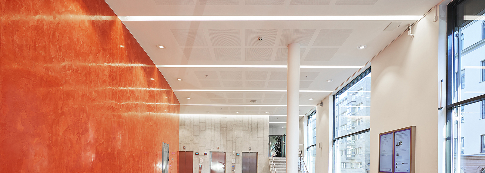 BYGGNADEN HAR EN stor glasentré där det har varit bekymmer med stark värme under sommarhalvåret. Genom att byta den äldre belysningen av metallhalogen och lysrör till led-armaturer bidrog man till en sänkning av temperaturen och fick samtidigt en lägre energiförbrukning.