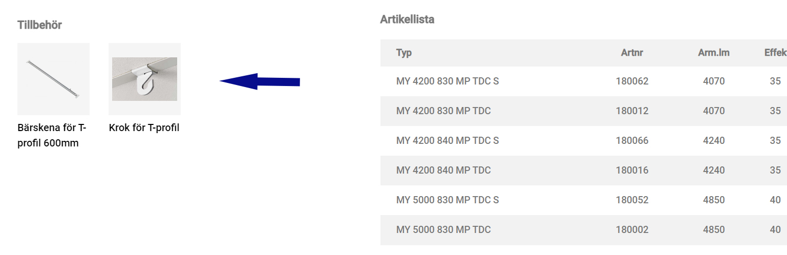 Alla tillbehör finns kopplad på produkt som är produktunikt men du kan också hitta en lista över samtliga tillbehör under toppmenyn.